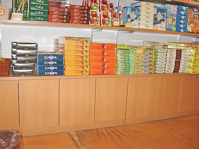 道の駅の土産物屋さんの商品棚(シェルフ) 静岡県伊東市道の駅マリンタウン お土産物屋さんの商品棚のを製作、取付。下に商品台収納家具、上は可動棚を設置。壁に直接、可動棚用レールを付ける方法で、コストダウンを図りました。観光で、伊東に来ましたら、ちょっと立ち寄ってみて下さい。 サイズ 家具 H600 W1200 D600 3台 壁付け棚 1200×350 6枚 外部面材 アイカ ポリ合板 内部面材 ラワン合板 隙間処理 なし 参考価格 ¥360,000(家具3台+棚6枚)(取付費、経費は別途)