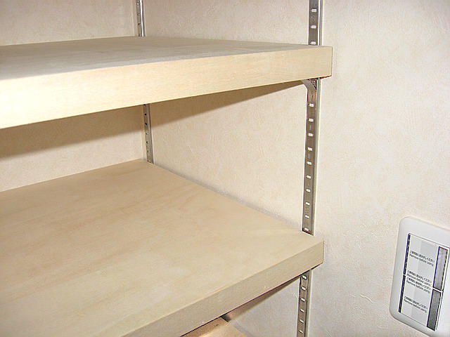 ウォークインクローゼットの収納棚 神奈川県足柄下郡湯河原町S様 ウォークインクローゼットの壁に直接、移動棚用レールをビスとめし、棚受けを設置して、棚板を上に乗せた、最も簡単な方法で、工事しました。壁の3面(コの字)に棚板を設置。この場合は、壁の下地は、ボードではなく、コンパネがベストです。 参考価格 建設工事なので非公開